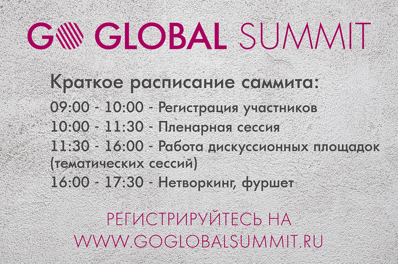 Подробную программу со спикерами и расписанием всех сессий Go Global Summit Вы можете скачать по этой ссылке